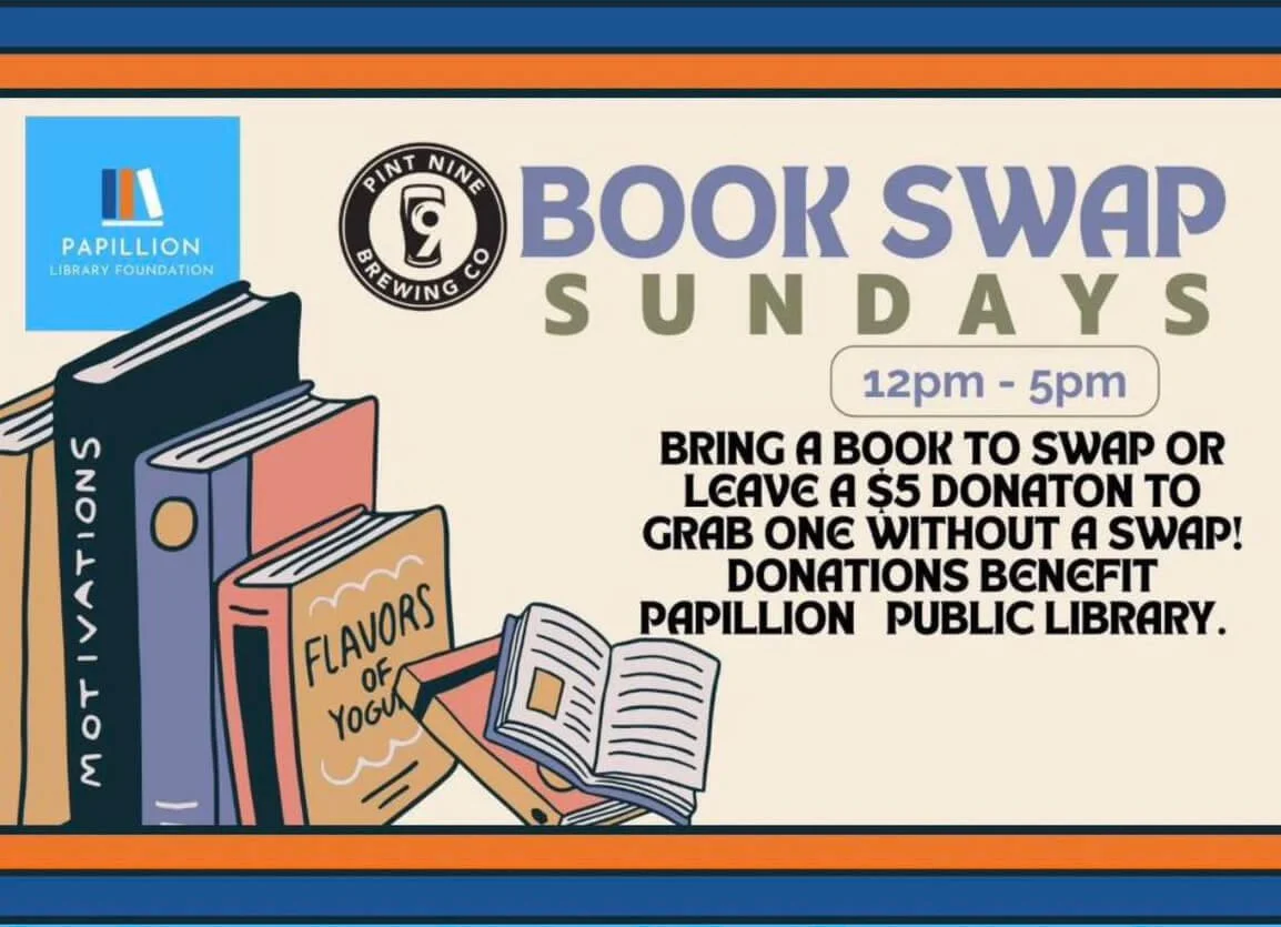 Back to All Events Book Swap Sundays Sunday, April 26, 2026 12:00 PM 5:00 PM Pint Nine Brewing Company 10411 Portal Road Ste 104 La Vista, Nebraska, 68128 United States (map) Google Calendar ICS Books and Beers! Every Sunday, bring a book you've loved and leave with one you are yet to discover! It's the perfect excuse to linger a little longer, take that extra sip or strike up a conversation with a fellow reader!