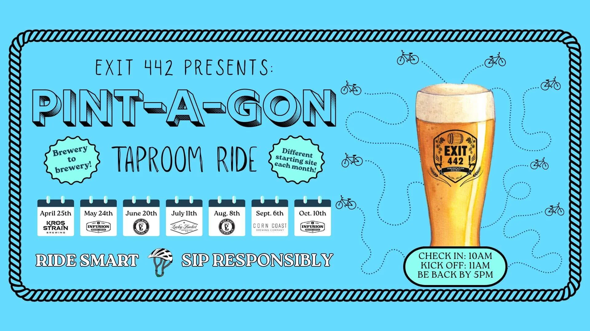 Hop on your bike and join us for a laid-back monthly ride between five awesome local breweries part of the Exit 442 Fermentation District. This is a fun, casual ride built for everyone. Hardcore cyclists, weekend cruisers, and anyone who just enjoys a good ride and a great local beer are all welcome.